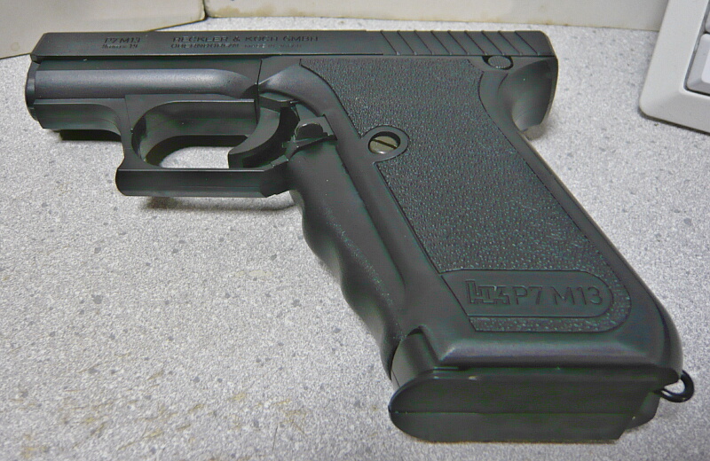 P7M13の外見上の個性ともいえる大きなグリップと、コンパクトなスライドによる一見アンバランスなスタイル。実際グリップはかなり太めで、ソーコムMk23に匹敵するサイズ。スクイーズコッカーが握っている中指と薬指を押し開こうとする力をかけるので余計太く感じるようになっています。マガジンキャッチは左右アンビタイプで、Mk23やUSPと操作性は同じ。握った手の中指の皮を挟んだりはしませんが、握った右手の親指が届かない位置にあるのは同じ。スクイーズコッカーは機能としてはグリップセーフティ以外の機能は無いので、ここがうっとおしいと感じる人はグリップパネルを外せばアクセスできるのでスクイーズコッカーの裏にあるスプリングを外して握った状態で固定してしまっても良いでしょう。