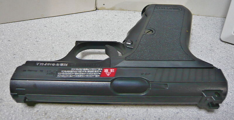 箱下側。P7はH&Kがまだハンドガンでは微妙なものばかり連発させていた頃の銃で、特にグリップ前面にグリップセーフティを兼ねたスクイーズコッカーを備え、これを握る事でストライカー(ハンマーに相当する、撃針を打撃するパーツ)をコッキングするという凝った機構を持っていました。また、ロッキングシステムも発射ガスの一部をフレームに固定された銃身の下にあるピストンへ送り、ピストンが前進位置で後退しようとするスライドを押さえつけて弾丸が銃口から出て発射ガスの圧縮が抜けるとピストンの圧力も抜けてスライドが後退を開始する、というここも凝ったメカニズムを持っていました。一方で前者はグリップの握り心地が悪く、後者はトリガー周辺が加熱するという欠点があり、販売的にも失敗に終わりました。この次のUSPでは比較的コンベンショナルなメカニズムになったもののこちらは成功し、VP70から続く変態銃の流れから脱する事となります。バリエーションとしては開発名であるPSP、量産タイプ初期型のP7、改良型で8発入り単列マガジンのP7M8、13発入り複列マガジンのP7M13、10mm口径仕様(10mmAUTO弾ではなく.40S&W?)のP7M10、小型弾薬を用いロッキングシステムを省略したP7K3などがあります。