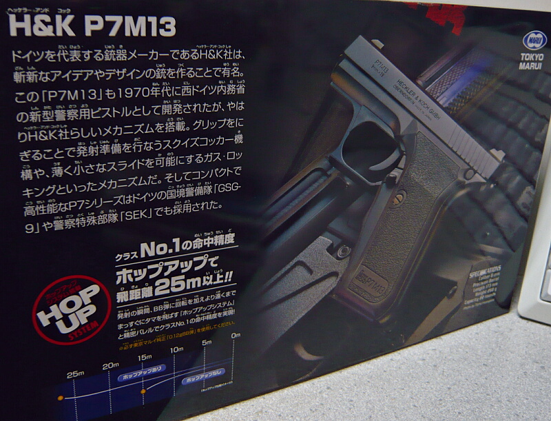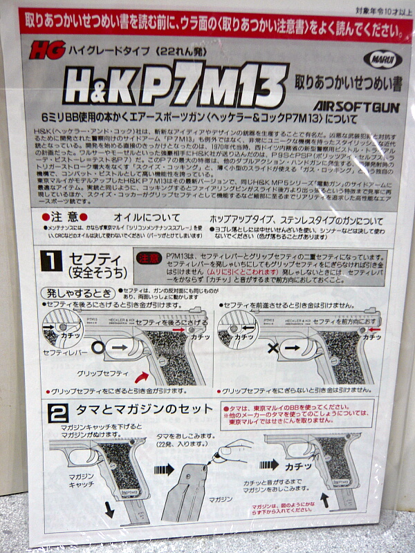 このP7M13も18歳以上用HOPなし版を昔持っていました。買ってすぐMr.カラーの104ガンクロームで塗装した上にクリヤーコートまで掛けたのですが、銃自体あまり使いやすくないのであまり触らず、存在が空気化してしまい結局まとめて手放した中に含まれて出て行ったのでした―――