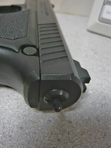 スライドを引いてコッキングすると、スライド後面にあるコッキングインジケーターが突き出ます。ここは機構状本来はスクイーズコッカーを握った時点で出てきますが、コッキングされているか?を知るためのものなのでエアコキ銃である本銃の場合にはこの動作で正しい事になります。フレーム左側面の後端にある丸いスイッチは本来はテイクダウンボタンですが、この銃ではマニュアルセーフティとして機能し、前方へスライドさせるとセーフティONとなりトリガーをロックします。ただ、このスイッチは新品状態だとメッチャクチャ固いので当たりがつくまで何度も固いものでON/OFFを繰り返しておいた方が良いです。グローブ装着だと実質操作不可であり、素手でもグリップを握ってない方の手指の爪などで操作するしかありませんが、無理をすると爪を割るほど固いので注意。昔は発火モデルガンに使う7mmキャップの撃ちガラを小さなネジで留めて、グリップを握った右手の親指で容易に操作できるようにしていました。