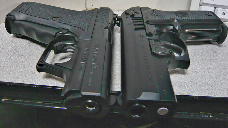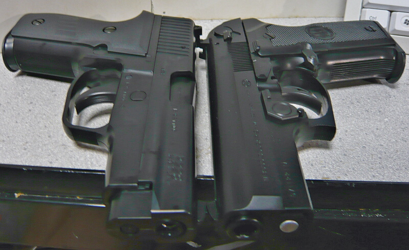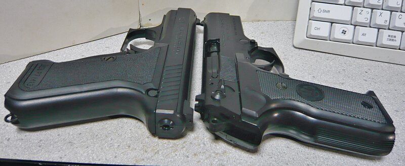 クーガーG(右)と。全長はほぼ同じ、グリップはクーガーGのが5mmほど長いです。どちらもスライドが上下に大きく、グリップは細身に見えるバランス。クーガーGは第三世代で新しいしギミックも多いですがタフさではP228に分があります。