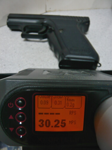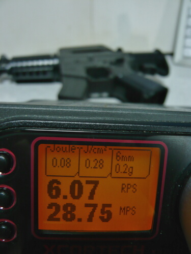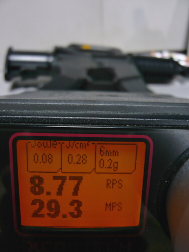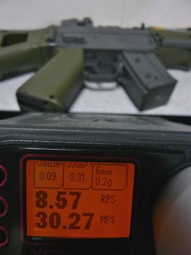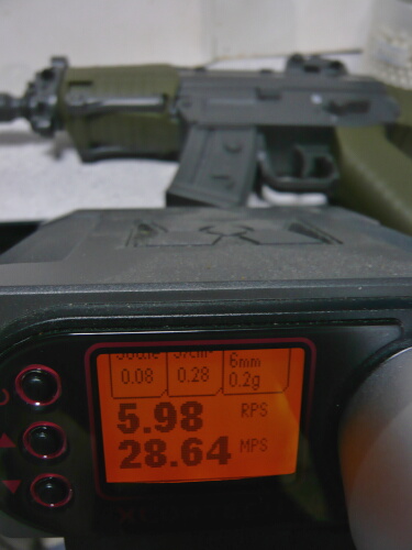 初速は28~30mps程度、サイクルは秒間6発前後。新品から撃ち始めはややサイクルが低く、少し撃つと当たりが付くのかややサイクルが上がります。上がった状態がこれ。ニッケル水素充電池だとやはりサイクルは低め。しかし充電すれば繰り返し使えるメリットは強いでしょう。