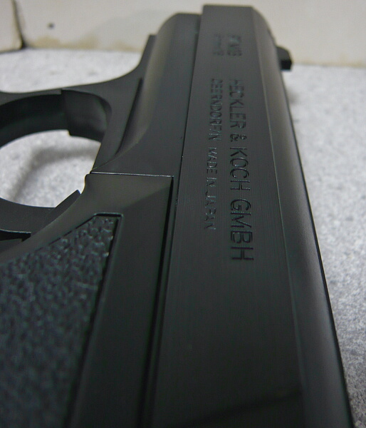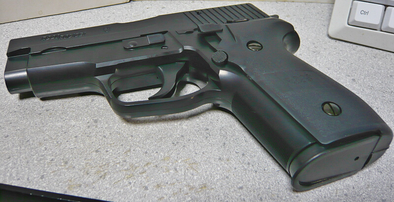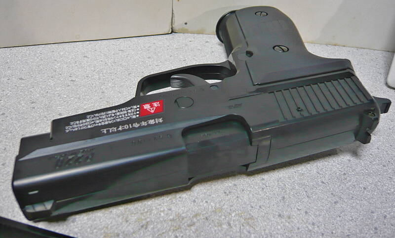 ただ、何か昔持ってたのと微妙に印象が違うな・・・と思ったら刻印が変わっており、SIG/SAUERの文字は銃のどこにもありません。スライドの刻印の他、グリップパネルも同様。グリップパネルは昔のはもっとヌメヌメしていた印象なのですが、サラリとしたつや消しになっています。