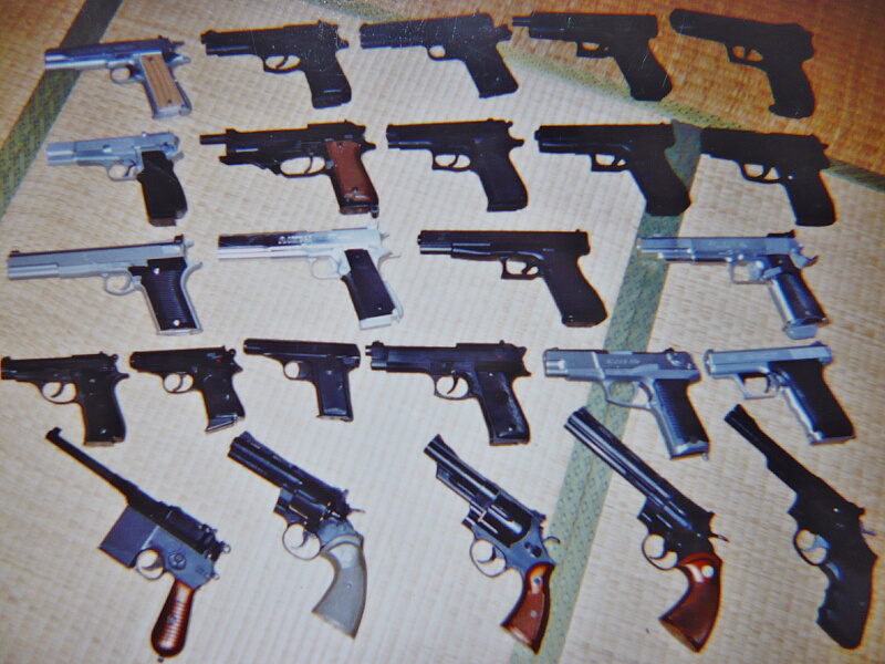 昔の写真を発掘してきました。摘発写真みたいで背景が畳なのが笑いを誘います。ヘタクソに撮ったフィルム写真で不鮮明な上、肝心の左側面の写真がこれだけというのにムカつきますが、上から4段目、一番右のブツが昔持ってたP7M13。セーフティの位置に緑色の物体(マルシンの7mmキャップ)があるのが確認できます。スクイーズコッカーも握った状態で固定されていますね。この写真、現存しているM92FSやオートマグⅢが居るのに昨日持っていたと書いたダブルイーグルや、残骸だけ残ってる4インチパイソンなどが無い時期のもので、ちょっと寂しい。94年頃の写真です。