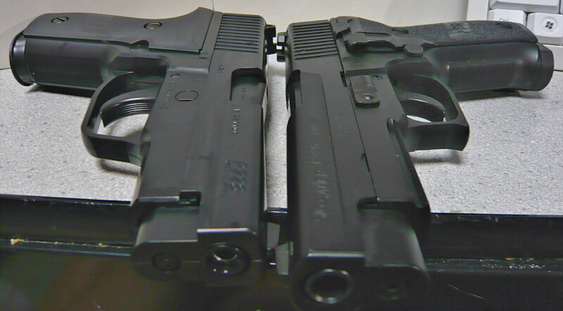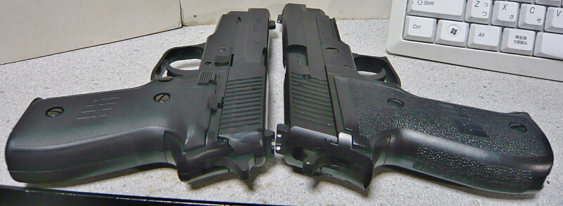 マルイガスブローバックP226レイル(右)と。スライド、グリップ共に長さ1cm程の差で、並べてみるとそんなに大きさに差がなく見えます。P228のグリップのシボ目は明らかに薄く、ここは好みに拠るところ。