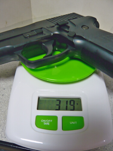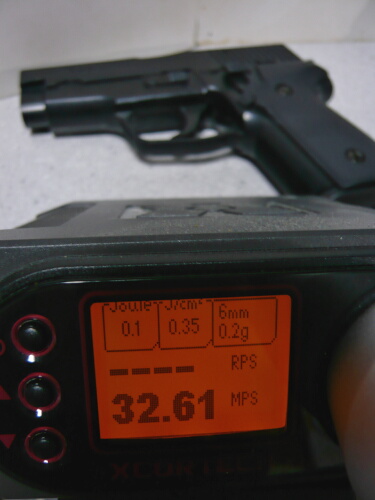 初速は32mps前後。10歳以上用ではやや元気がある方。発射音がパッヒーンと金属的な反響音がします。銃を振るとカシャカシャ音がするのでどっか緩い部分があるかもしれません。トリガーは他のマルイエアコキと違いグニャグニャ感がほとんど無くガッシリしており非常に良好なタッチですが、欲を言えばトリガーの初期位置~引ききりの位置はもっと後ろ寄りだったら非の付け所がなかったでしょうか。ガスブロP226レイルでいうとダブルアクションの引き始めから5mmくらいがトリガーストロークになっています。ホップアップはやはり0.2g調整で、付属の0.12gだと5~8m付近から上へすっ飛んでゆきます。