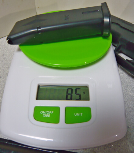 初速は変わらず、サイクルは秒間8.5発強にサイクルアップします。ニッケル水素充電池は1.2V×4本で4.8V、アルカリ乾電池は1.5V×4本で6Vと差があるためです。もっとサイクルアップ!とグリップ下から配線を出して電池を外付けして電池5本以上の仕様にするのはショートや内部機構の破損などリスクを伴います。何より電池をぶら下げてるのは美しくありません。どうせやるならM203型電池ボックスだとか凝って欲しいものですね。