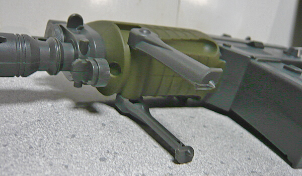 可動ギミックとしてハンドガードに沿う形で畳まれるバイポッドを立てる事ができます。ただし長さが全然足りず、また角度は真下を向くという、コミカルで役に立たないというのがミニ電動ガンらしいところ。