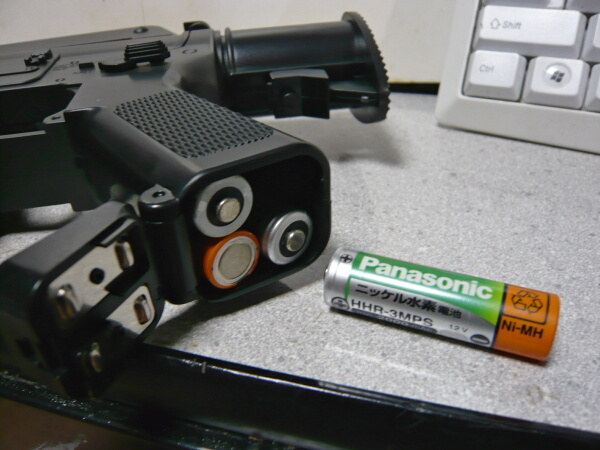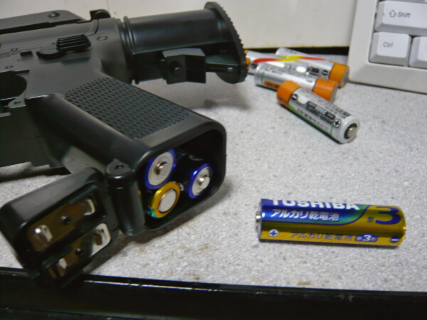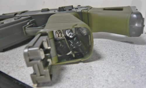 推奨されていませんがとりあえず単三型のニッケル水素充電池を入れます。グリップは小指までちゃんと掛けられる長さがあり、トリガーこそ後ろ寄りなものの握り心地はミニ電動ガンの中ではマシな方でしょう。手や腕が太いとストック下の突起やバットプレートの下の端がちょっと手首に干渉するかもしれません。私は手のひらが大きく指や腕は細めなディメンションですが、手首だけで銃口を上に向ける時にストックが手首に当たるのが気になる程度で、普通に握るには特に問題ありませんでした。まあ大人でも普通に握れますよ、と。