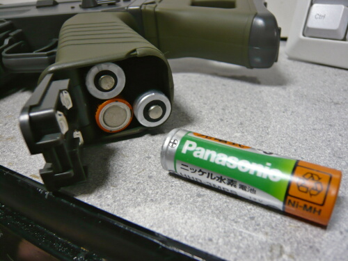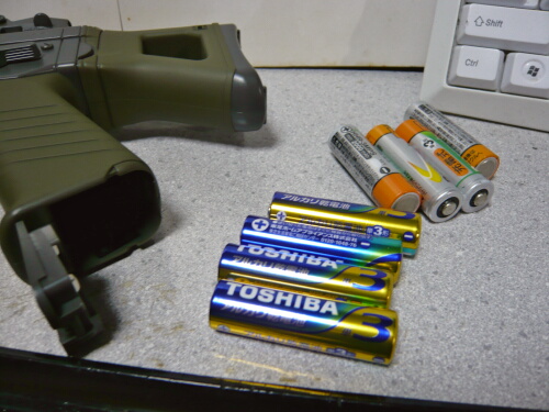 初速は上がっていますが誤差範囲。サイクルは秒間8.5発強ほどになり、音も元気な感じになります。コストかサイクルか、使う人が好みで使い分けると良いかと思います。ただ、ニッケル水素充電池は買うと結構するし、乾電池は案外安く売ってたりするので(大体充電池1個分の金額で乾電池10本くらい買えるな感じ)、コストよりは面倒臭いゴミがそれだけ出る事の方を気にして充電池にする人もそれはそれで間違いではありません。