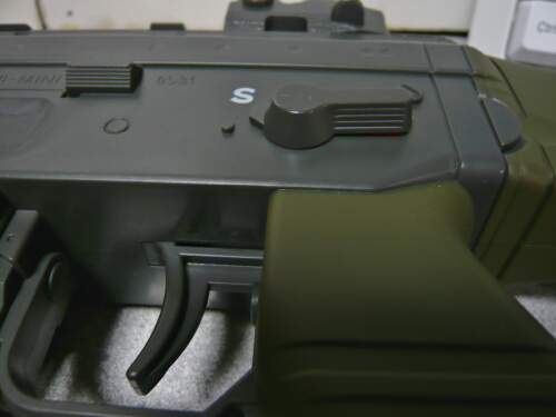 撃つ時は右手の親指でセレクターをAUTO方向へ回して押さえながらトリガーを引きます。AUTOまで180度回りますが、せいぜい30度くらい、上画像の程度に回せばトリガーを引く事ができます。左手では操作できないので両手に持って撃ったりはできません。