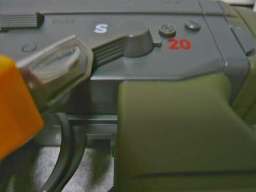 撃つ時はグリップの上左側面にあるセレクターを右手の親指で手前から下を通って前の方へ時計回りに回した状態で押さえながらトリガーを引きます。右側にもセレクターがありますがそっちはダミー。