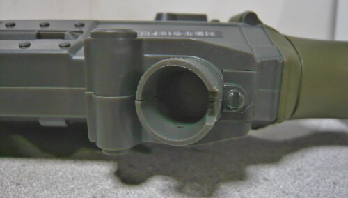 電池は単三が4本。推奨されていませんがエネループなどのニッケル水素充電池も一応は使えます。電池の入れる向きはグリップ内にステッカーで示されています。グリップ内に電池を入れる時、やや斜めに入りやすく端子にきちんと接しない事があるので、電池を入れたけど反応しない!という時はフタを開けて閉め直してみたり、電池を挿しなおしたりしてみると接触が戻る傾向にあります。当然、電池が切れてると何をしても無駄ですが。フタは閉める時ちょっと固いですがこんなもんです。ギューッと押さえてスライドスイッチを後方へスライドさせてロックさせます。