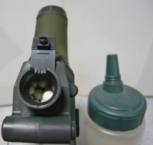 弾はアリイのBBボトルなどから流し込むとやりやすいでしょう。装弾数は約80発。ギチギチに入れすぎるとフタが閉まらなかったり、中で弾が動かず給弾不良を起こしたりするのである程度余裕を持たせておいた方が良いでしょう。
