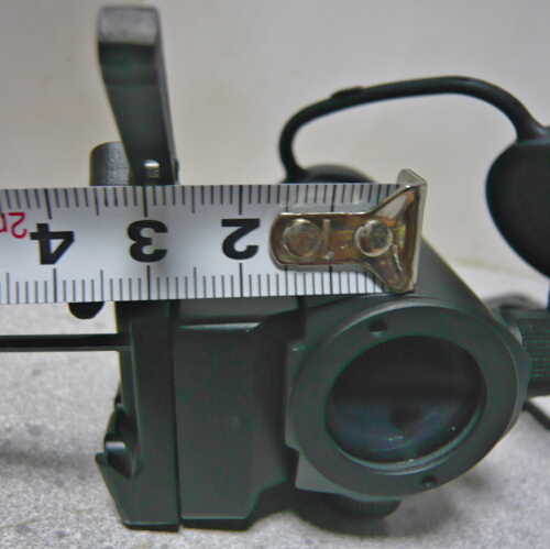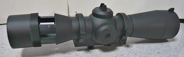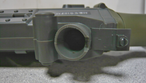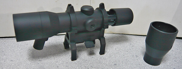こちらはもう一方の270連射マガジンよりは単純な形状。キャリハンマウントに1インチタイプのマウントリングを介して大きめのスコープを載せたような姿。対物レンズの上にフロントサイト、上下レティクル調整ダイヤルの上にリヤサイトがあり、銃側のリヤサイトが実質使えないので代わりになります。接眼レンズ側は後方へスライドして開き、ここから弾を流し込みます。