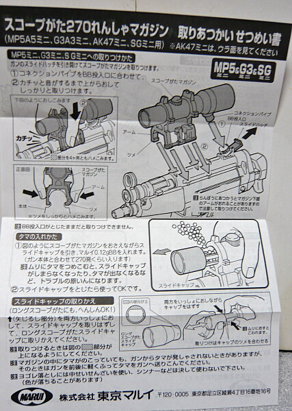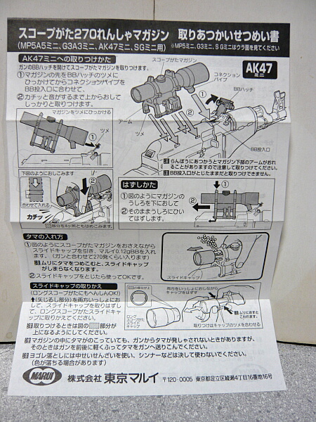 説明書裏面。こちらにはAK47ミニへの取り付け方が示されており、MP5ミニなどとは前後逆に取り付けるようになっています。装弾数は銃本体内と合わせて270発くらい、とされています。MP5ミニ・G3ミニ・SG550が約80発、AK47ミニが約90発なので180~190発ほど増加する事になります。