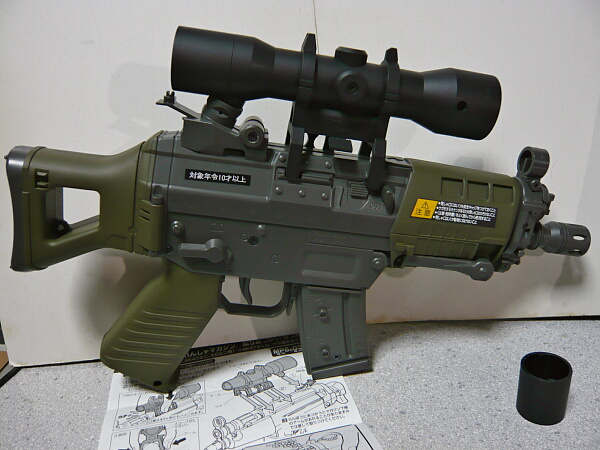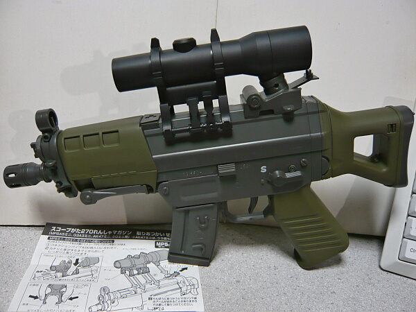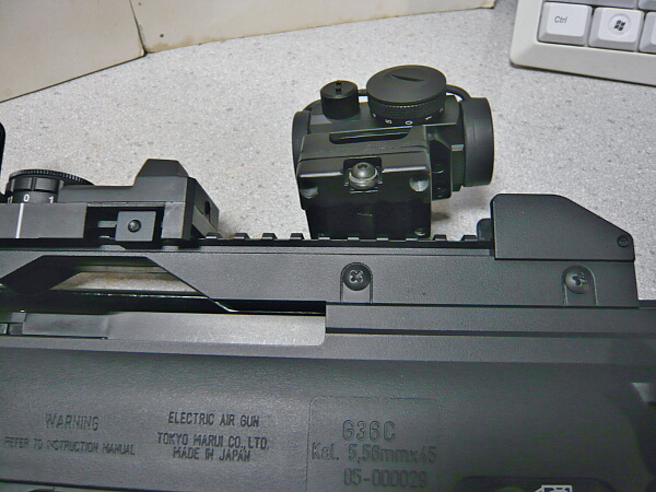 装着したところ。スコープ側のツメがやや窮屈なので折らないように注意。装着したら銃側の給弾口のフタを前へ押してスコープをガッチリ固定してやりましょう。ただしここは撃ってるとすぐ緩むので度々押してやると良いでしょう。
