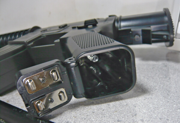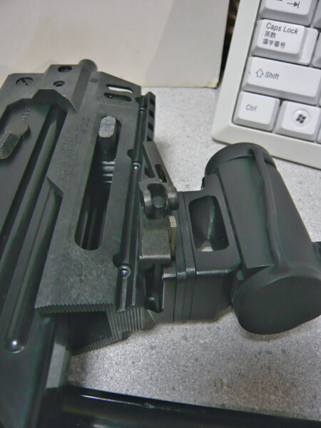 グリップ底部のスライドスイッチを前方へカチッとスライドさせるとフタが開き、中は電池ボックスになっています。グリップ形状は小さいですが、小指が余るUZIミニや小指が入らないステアーミニに較べると大分握りやすくなっています。ただストック下面が手首とぶつかりがちで、手や腕が太い人は窮屈かもしれません。