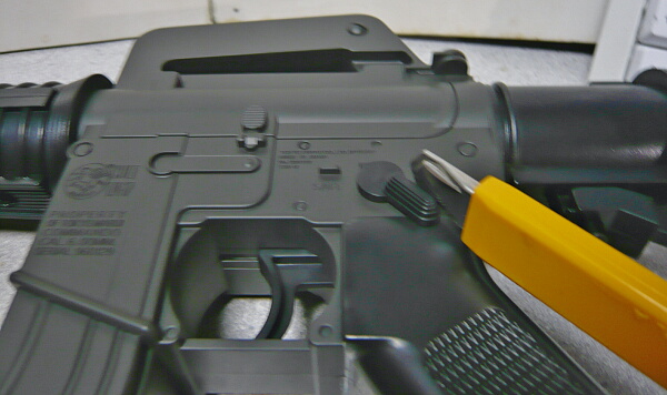 リヤサイトのドラムの後ろにマイナスネジ状の突起があるので、ここに爪などをかけて後方へ引っ張ると給弾口が開口します。