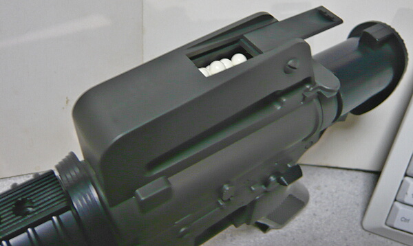 弾はキャリハン上面後ろ寄りの、リヤサイトがついている部分を後ろ側へスライドさせると開口する給弾口へ流し込みます。装弾数は約70発。ギチギチに弾を詰め込むとフタが閉まらなかったり、中で弾が十分に動かず給弾不良を起こします。少し余裕を持たせておいた方が良いでしょう。また、装弾数全部を継続的に全部撃てるものではなく、撃っていると自由落下式ゆえに給弾が途切れて空撃ちがちになるので途切れるようになったら一旦トリガーを離して銃を振ってやりましょう。撃ちながら振ったりしないように!