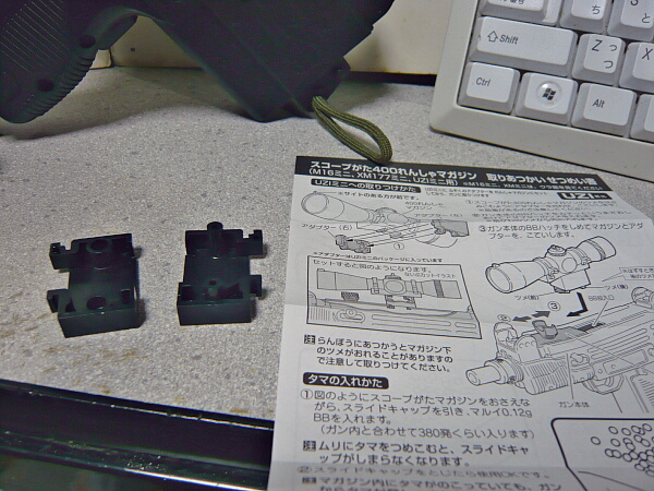 ウチにはUZIミニもあるのでそちらへも装着してみましょう。まずUZIミニに付属のアダプター。左右モナカになっているこのパーツをスコープ型マガジンのマウントベース部分の下部分を左右から挟むように取り付け、チャージハンドルを前方にスライドさせて給弾口を開き、そこへはめ込みます。最後にチャージハンドルをちょっと後方へ戻して押さえて固定すればOK。