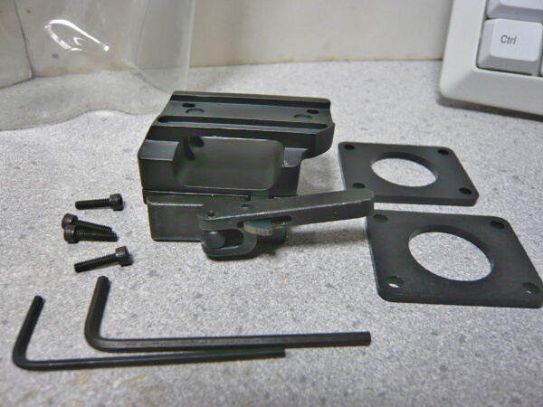 タクティカルマウント、といってもぶっちゃけてしまうとQDレバーの付いたT-1ドットサイト専用のハイマウント。ウチにはこれと同じところで買った安いT-1ドットサイトのレプリカがあるのですが、ローマウントなので案外使いどころが無く着脱も六角レンチが必須で面倒臭い・・・しかしT-1用のハイマウントというのはそれだけで5千円~8千円と結構な値段がします。T-1本体の方が3500円くらいのものなので本体より高い・・・と問題を先送りにしていたところへ見つけたこのマウント。多少質が悪くてもこの値段なら買いやすい、つーか買おう!となったわけです。しかもこれスペーサーで高さを変えられるという便利なもの。