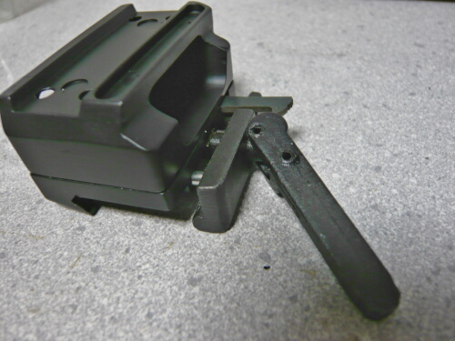 レイルの左へオフセット、レバーを右に出したい場合はこう。というかオフセットした側にレバーは出せない構成。レバーを右に出してレイルと同軸にしたい場合は上写真の状態からマウントを前後逆にしてT-1本体へ取り付けます。
