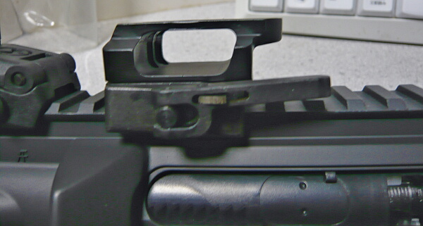 レバーを起こしてレイルに掛かる部分を引き出した状態で銃のレイルにガチャガチャッと掛けます。銃はトイスターのエアコキM4A1。マルイの電動M4と同じでレイル幅が微妙に大きい(約22mm)のでやや窮屈めですが、ちゃんと掛けられます。
