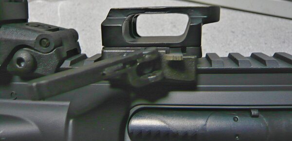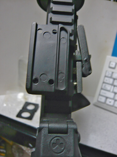 ちょっと残念なのがリヤサイトで、フロントサイトは特徴を捉えているもののリヤサイトは小型拳銃のような簡易なものになっており、リヤサイト自体の高さがフロントサイトに対し高い位置にあってその前数センチが水平面であるためにリヤサイト越しにフロントサイトを見ようとするとリヤサイト前が盛り上がっていて見えない形になっています。