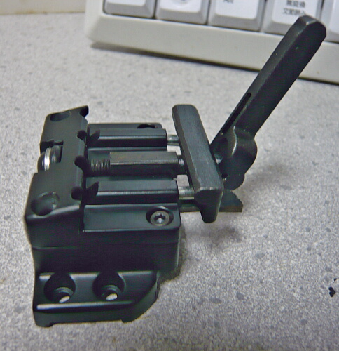 QDマウントの付いたレイルアクセサリは初めてなのですが、レバーの付け根近くを貫通している鉤状のストッパーを動かして解除しながらレバーを手前に引くと、レバーの取り付いてる部分が引き出されてきます。引き出された部分は銃側のレイルに掛かる部分の片側で、レバーを起こすと引き出され、レバーを倒すと引っ込んでゆきます。動きはちょっと渋く、ストッパーも手の爪が欠ける勢いで固いので最初は動かすのがツライと感じるかも。
