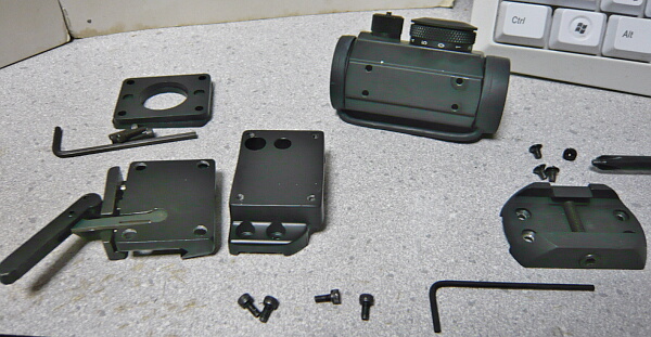 T-1の下に付いているローマウントを外し、タクティカルマウントもベースとマウントを分離します。T-1のレプリカにも色々あってマウントとの間が接着されている場合もあるそうですが、そういうものの場合は頑張って引っぺがしてやる必要があります。
