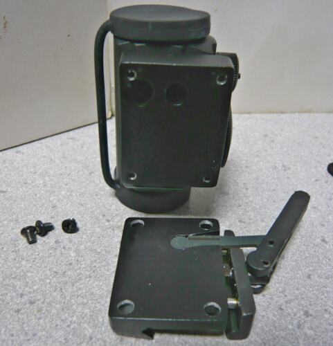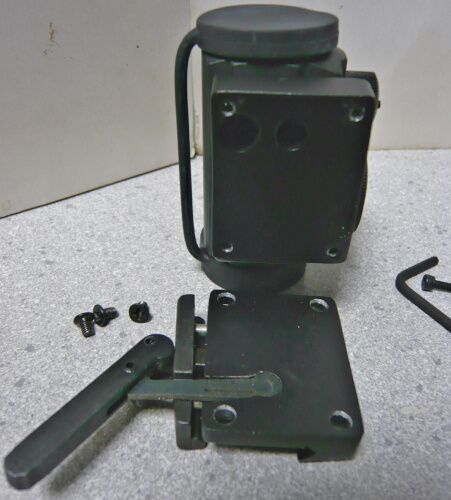 QDレバーの付いたレイルと接するベース部分と、T-1と接するマウント部分は出荷状態でネジにより結合されています。上画像はレイルと接する面が上になっている、ひっくり返した状態。
