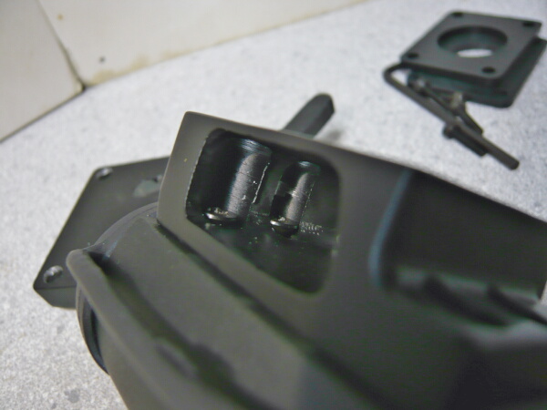 挟む枚数が決まったらマウントとベースをネジで結合します。スペーサーを1枚でも挟むと元々刺さっていたネジは長さが足りなくなるので、付属の長い方のネジを使用します。斜めにネジ切りがされていてネジが斜めに刺さっていくのが気になりましたが、ちゃんと固定できてれば問題なし。