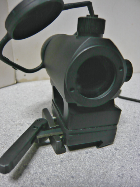 取り付いたらマウントを揺すってガタが無いかチェック。締めきらずガタついてる時は横から貫通しているネジを六角レンチで締めるか、レバーを起こした状態でクルクル時計回りに回すと締まります。取り付いた状態を見ると、T-1本体が載る部分が左に大きくオフセットしています。レバーの付いているベースとその上になるマウントは前後逆にする事でこのようになる構造をしています。もちろん、この状態からバラしてマウントの向きを前後逆にすればレイルと同軸になります。オフセットマウント状態は前後のアイアンサイトがフリップアップなどではなく固定のものを使用している場合に、両方いつでもすぐ使いたい!という場合に利用します。ドットサイトの場合はドットサイトのチューブを通して前後のアイアンサイトが利用できる場合が多いですが、アイアンサイトとドットサイトがそれぞれ高さが違う場合、大抵はアイアンサイトが利用できないのでそんな場合に。ただし銃の軸からズレたサイトは慣れないと中々うまく狙えなかったりします。そこは「練習」で。