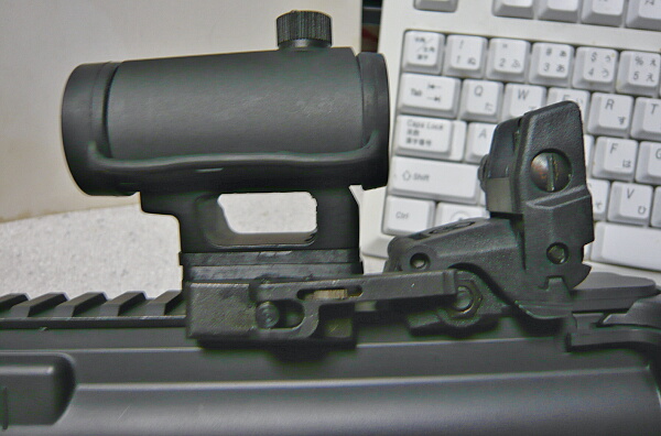 組みあがったら早速銃へ載せてみます。スペーサーは2枚とも挟んでちょうどMBUSと同じサイト軸になりました。マウントは横方向に穴が抜けており、T-1のハイマウントというと単純な箱型をしているものが多いので、人によってはイメージと違う・・・というのはあるかもしれません。
