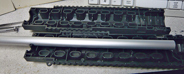 ハンドガード部内のインナーバレルの通る部分はインナーバレルの外径に合わせた通路なのでここを削って拡げ、アルミパイプを保持できるようにします。