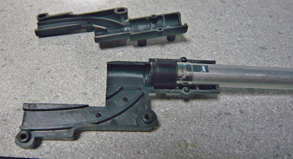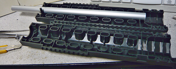 インナーバレルはレシーバー部から出ている1本だけにして、それより前にあるインナーバレルとアウターバレルを撤去。ハンドガード部を左右に分ければはめ込まれているだけなので簡単です。しかしそのままではハンドガードの先端の穴から出る前にハンドガード部内の隔壁に弾がぶつかってしまうので、インナーバレルより内径の広い筒を通してやります。用意した筒は外径15mmのアルミパイプ。内径は13mmで、アウターバレルを兼ねます。アウターにはちょっと細いですが、M14のアウターバレルとほとんど同じ程度の太さなのでまあ良しとしましょう。
