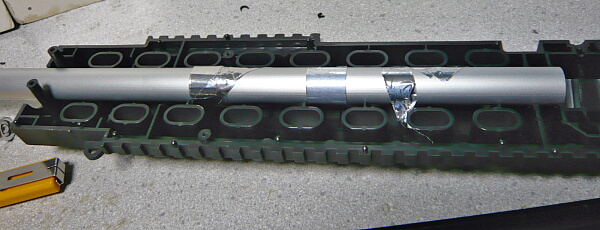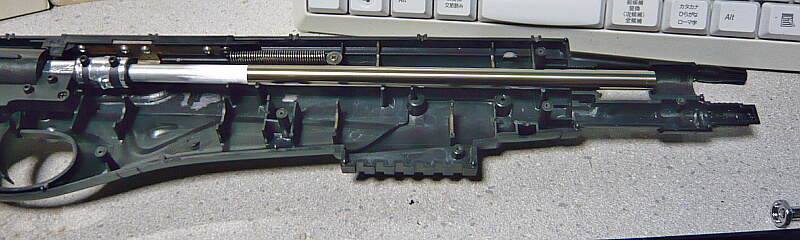 銃に組み込んだところ。ステンレスパイプを保持する左右の押さえの部分は元のプラバレルより太くなった分削る必要がありますが、元々ルーズなのであまりゴッソリ削る必要はありません。あとはアウターバレルの内側とフィットするようにステンレスパイプの先端寄りをアルミテープで太らせてやります。
