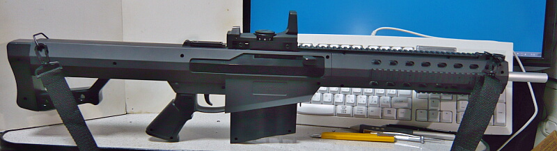 方々で性能に関して過剰な期待をされているバレットのチープガン。インナーバレル長だけなら500mm以上と長大ながら所詮はプラ製の8cm弱しかないバレルを8本連結させているようなブツなので実際はバレル内に段はあるわ曲がってるわ気密も抜けてるわでろくなもんじゃありません。いざドットサイトを載せて撃ってみれば初速も安定せず、集弾性もひどいもの。
