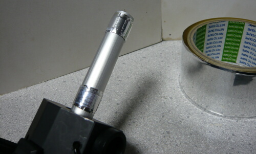 すでに取り付いているアウターは外径15mmなので1mmのズレはアルミテープを巻いて埋めます。後は30cmに切った18mmパイプを差し込むだけ。ちょろいちょろい。