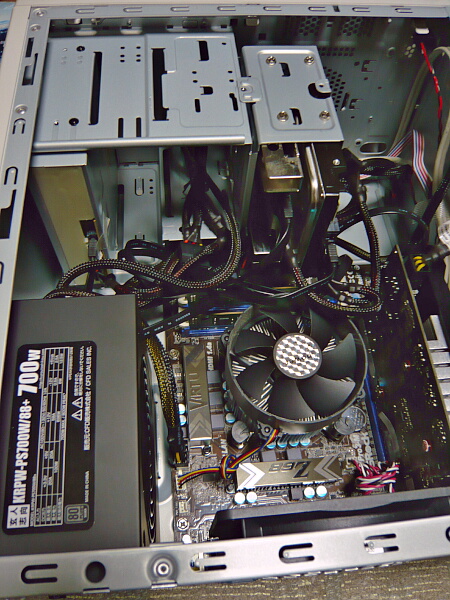 プラグインのケーブルを差してゆきます。このPCの場合は電源⇔光学ドライブと電源⇔SSD・HDDの2本のみ。ケーブルは枝分かれしていますが元々ついていた状態を見るに一番末端から上位ドライブになるのかな?一番末端のコネクタをSSDに、2番目のコネクタをHDDに接続。光学ドライブへは末端の端子のみを接続。接続できたらケーブルを元あった位置辺りへ流しておきます。HDDから出ているケーブルがCPUファンに当たりそうですが当たらないように這わせます。光学ドライブへのケーブルの余りはあいているベイへ放り込んでおきました。SSDとHDDのケースを元通りに差込み、ここと電源のネジを締めて固定。これでとりあえず換装は完了です。