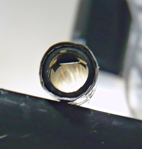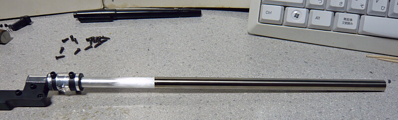 外径9.5mmのステンレスパイプを適宜に切ってインナーバレルの延長にします。内径は8mm強でインナーバレルの太さに対し僅かに狭いのでインナーバレルの外側を180番のサンドペーパーで細めて差込みます。ステンレスパイプはアルミパイプに較べ金ノコで切るのが大変ですが、肉薄だし細いので何とかなります。