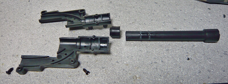 まずはモナカオープン。インナーバレルはプラ製のものが3本繋げてあったもののうち一本が軸ズレしていて段差になっていたので破棄し、マルイのオートマグⅢのインナーバレルを代わりに入れていました。しかし所詮は継ぎ接ぎであり、抵抗になっているのか初速も集弾性も上がらず・・・またホップアップもありません。そのため飛距離は銀ダンよりも無く、10m程度。