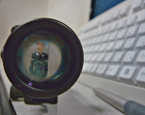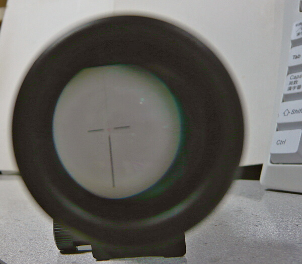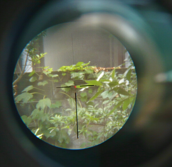 このくらいに拡大されます。お座敷シューターにはピントが合わせにくく辛い実用倍率かもしれません。アイレリーフはおよそ2~4cm、それ以上離れると近距離にピントが合うものの像が小さくなってゆきます。