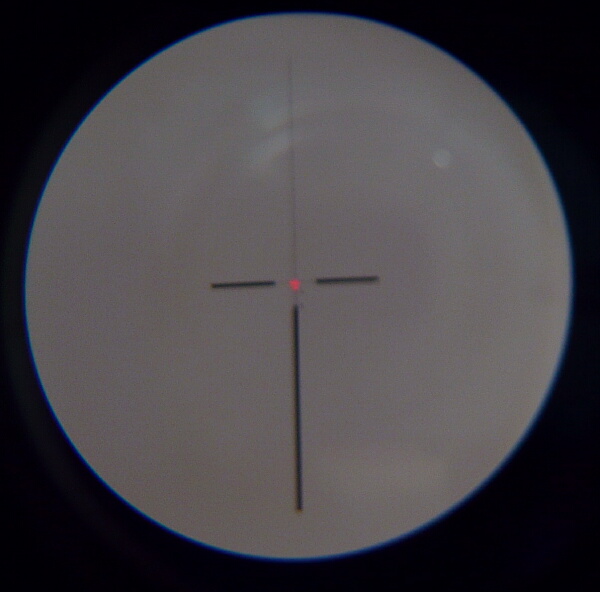 レティクルは十字型で横の線が短く、中央と上方向が細く、中央下には目盛りがあり4と6と数字が振ってあります。室内だと発光は暗く、蛍光灯の光の真下とか光源が比較的近くないと光って見えない事があります。