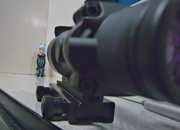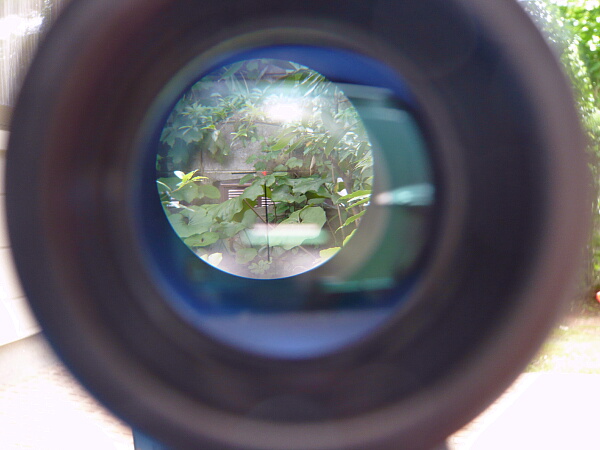 接眼レンズ側から覗き込んだところ。レンズは緑掛かったコーティングですがあまり色が付いている意識をせずに済むクリヤーで明るい見晴らし。ただ4倍固定倍率のスコープなので焦点距離が合わない距離で覗くとぼやけるのは当然なのですが、かなりレンズに目を近づけないと焦点が合いません。この辺はやはり話しに聞いていた通り・・・