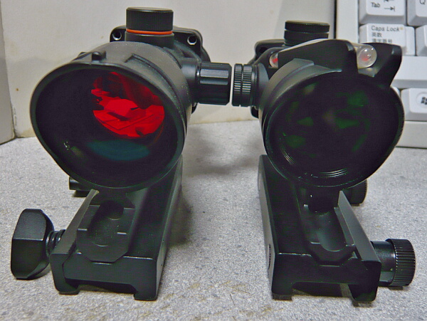 前から。TRD(左)は赤色発光のドットサイトなのでルビーコートされていますが、TA31の方は緑掛かった薄いコート。用途が違うのでハーフミラーにはなっておらず、反射はほとんどありません。