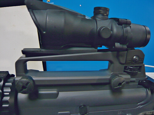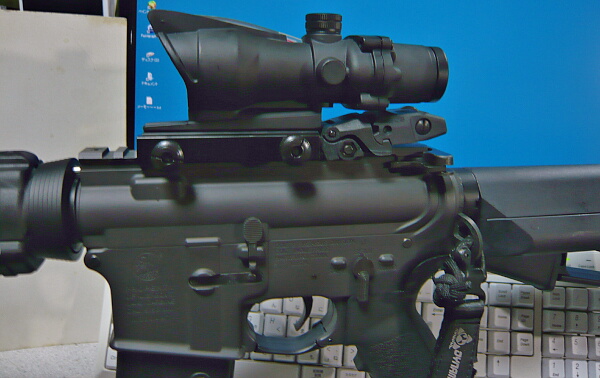 マルイM4A1に装着したところ。MBUS2を装着していると真上に接眼レンズが来てしまいますが、たとえMBUS2を立てたところでスコープ越しだとフロントサイトが見えないので素直にMBUS2を外してACOGをレイルの後ろいっぱいに寄せた方が良いでしょう。カッコ優先でレイルの中央~前寄りにするとアイレリーフが遠くて使い物になりません・・・