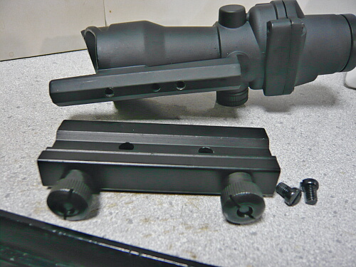 中央の穴はM16/M4キャリハンの上に載せる時の固定ネジですが、ここへの取り付け用のネジは付属していないので別途適合するネジを用意しなければなりません。また、キャリハンの上に本体をハメるのもかなり窮屈。強引に押し込んでやっと入るので金属製キャリハンだと無理かもしれません。
