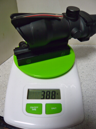 おっとそうそう重量は388g。ドットサイトと較べると重いものの、スコープとしては標準的。